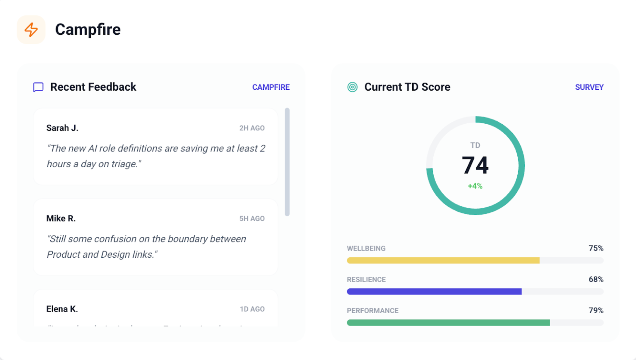 Collect feedback, track wellbeing and resilience through integrated pulse surveys.