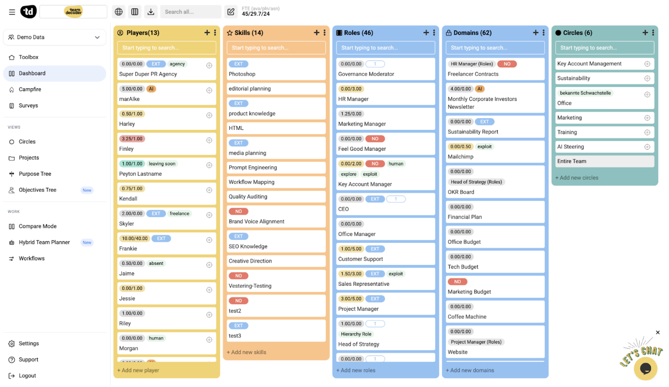 Strategies shift and workloads explode. Don't rely on static org charts or dead Miro boards. teamdecoder gives you a live steering cockpit to clarify who does what, identify where AI can take the load, and eliminate "not-my-job" zones.